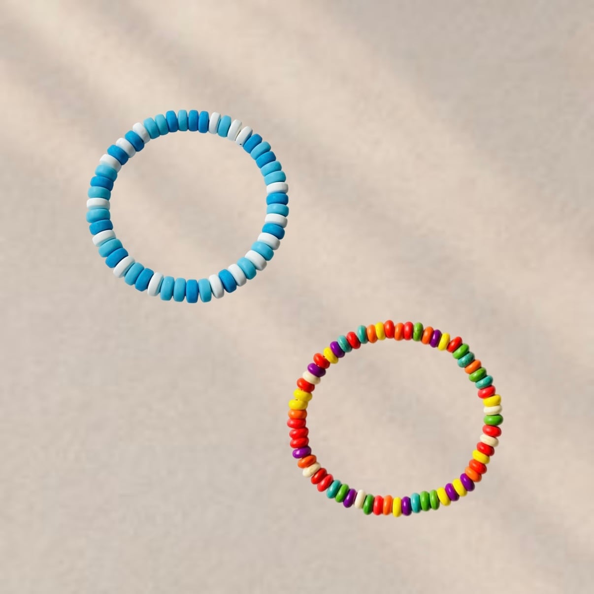 鮮やかな色合いが目を引く、合成ターコイズ染めビーズを使用したハンドメイドブレスレットです。赤・オレンジ・黄色・緑・紫など、カラフルなビーズがランダムに配置され、ポップで楽しい印象を演出します。伸縮性のあるゴム紐を使用しているため、着脱も簡単で、手首にやさしくフィットします。コーデのアクセントにぴったりです。