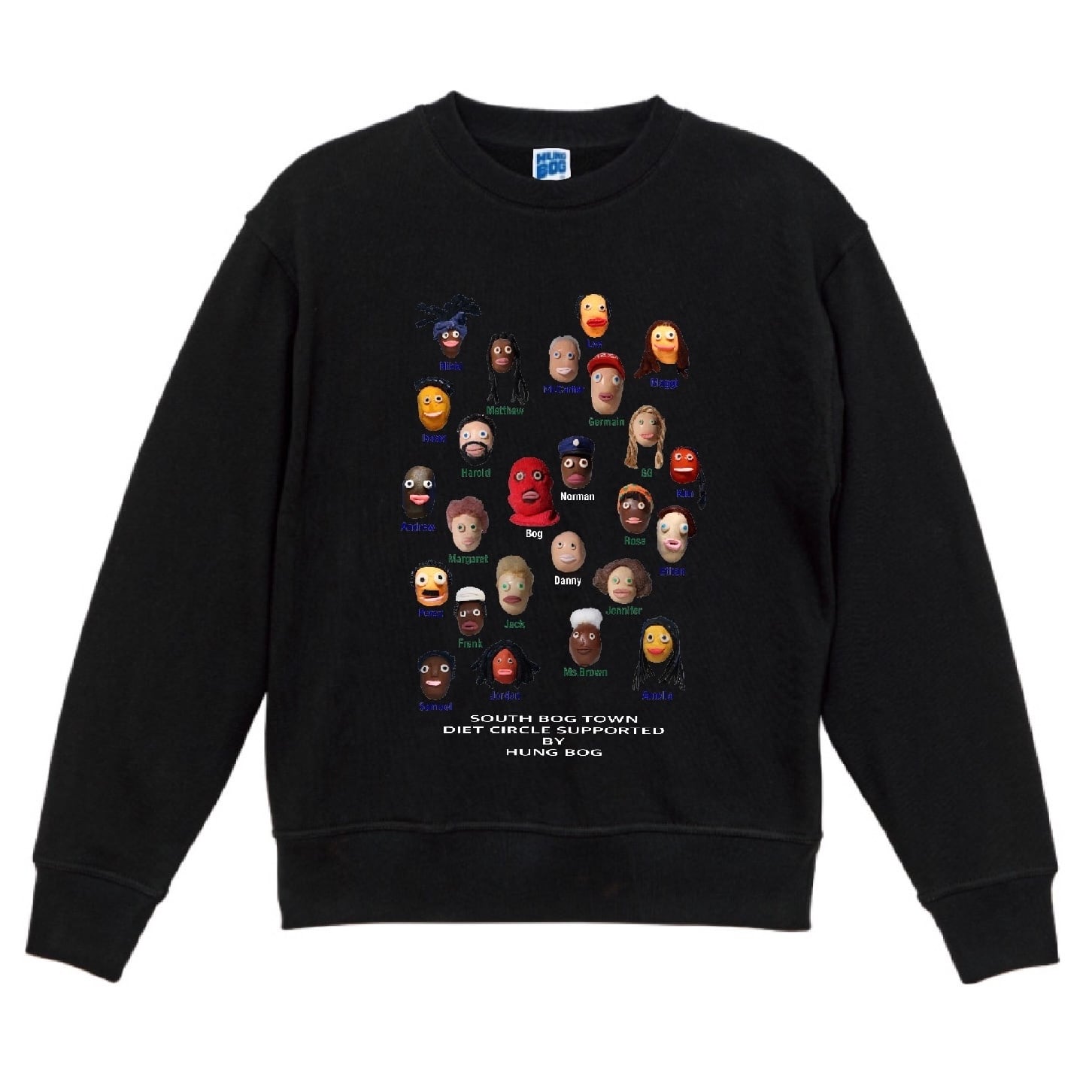 今作のコンセプトは、架空の町(サウスボグタウン)のダイエットサークルが1984年に行った合宿用スウェットです。フロントには粘土で作ったメンバーの顔と名前がプリントされています。