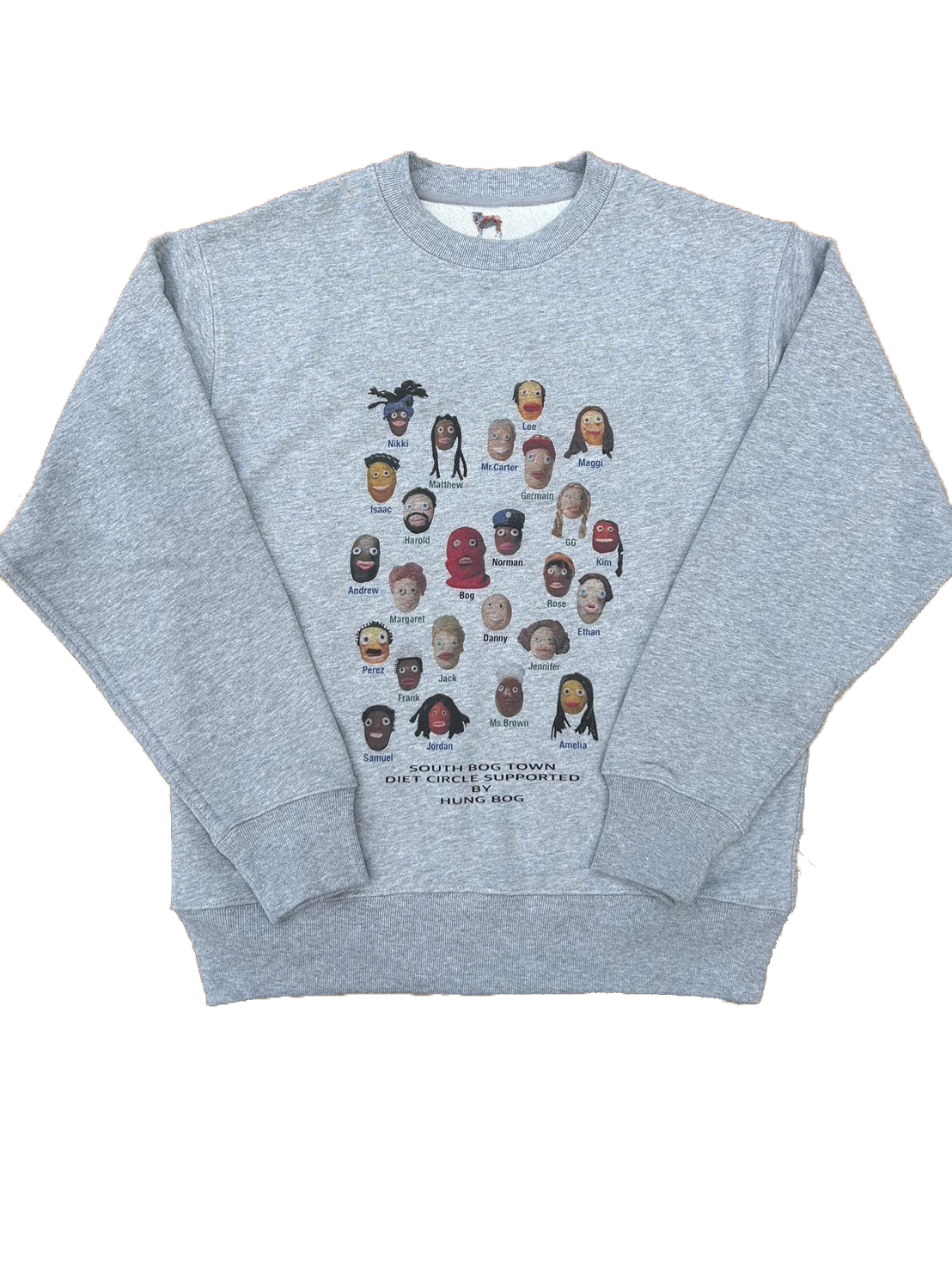 今作のコンセプトは、架空の町(サウスボグタウン)のダイエットサークルが1984年に行った合宿用スウェットです。フロントには粘土で作ったメンバーの顔と名前がプリントされています。