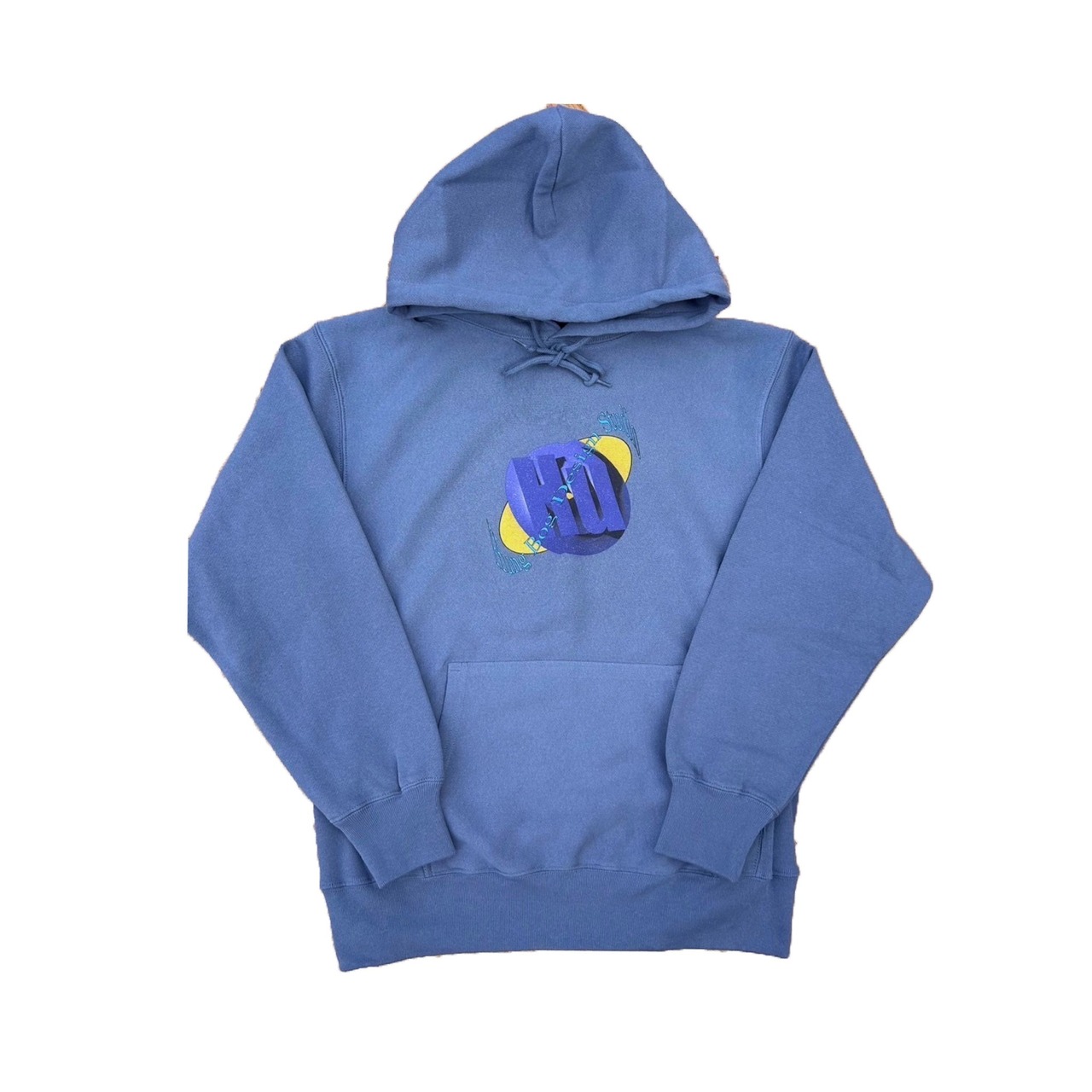 12ozの裏起毛パーカーしっかりした生地でフードが立つのが特徴です。フロントに架空のデザイン会社のロゴを落とし込み、企業ユニフォームをイメージした1着です。