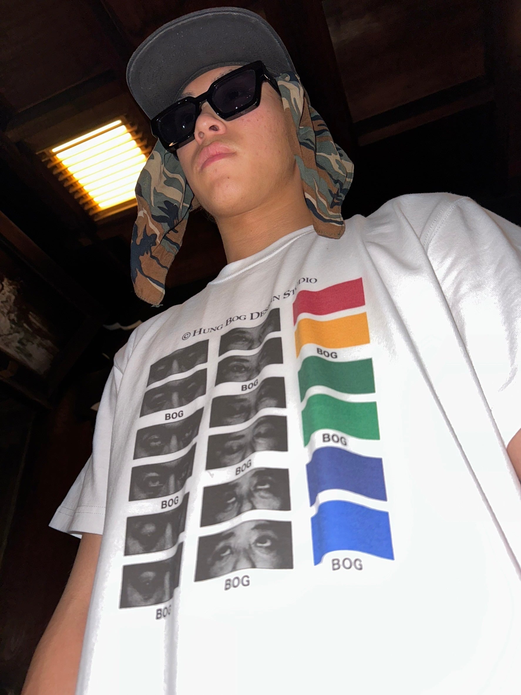 デザインスタジオで使用されている鮮やかなカラーチャートとこちらを見つめる目のプリントが魅力的なTシャツ。