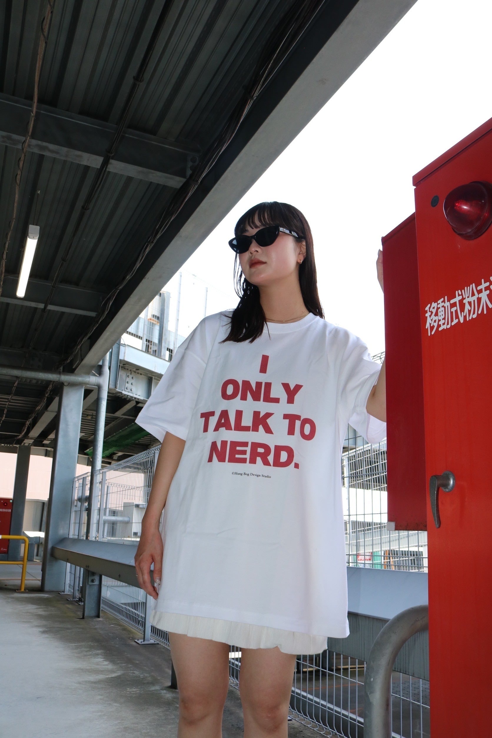 "私はオタクとしか話さない"プリントを落とし込んだTシャツ。シンプルながらもメッセージ性の強さでインパクト大の1着です。7.1オンスの厚手生地を使用しているので、着用時のシルエットも綺麗なTシャツです。